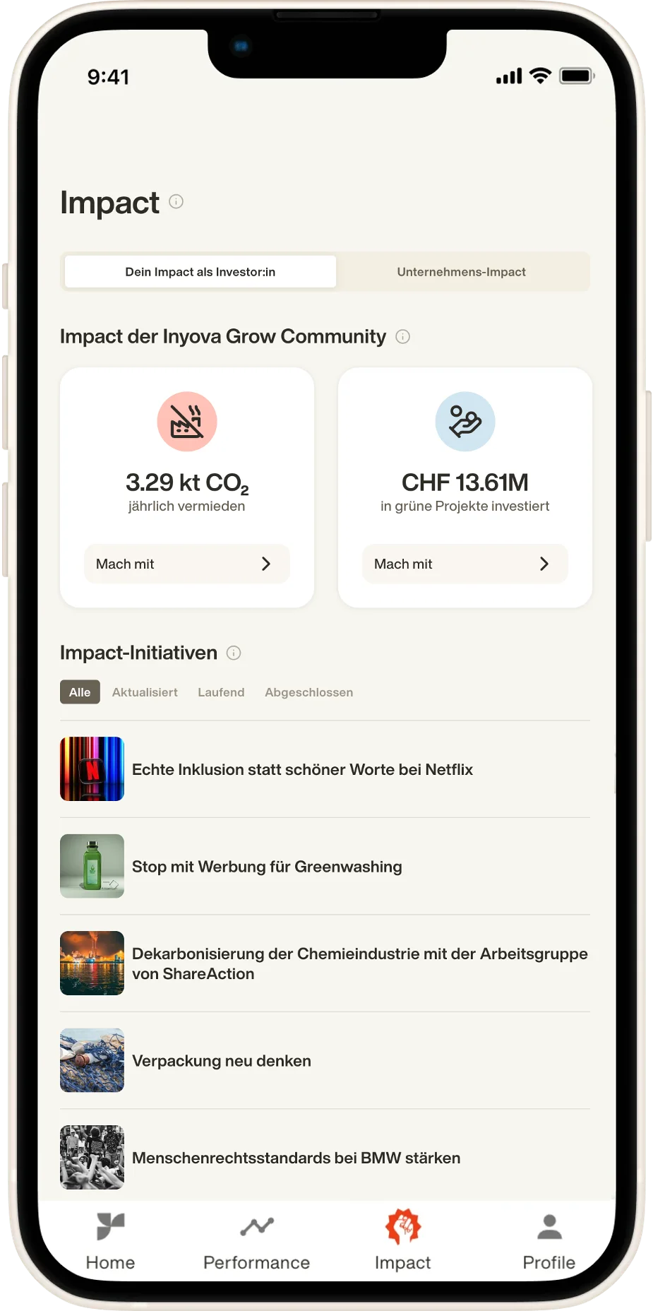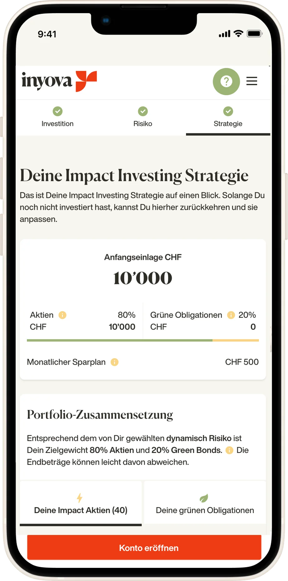 Inyova bietet Impact Investing für alle Lebenslagen. Aktieninvestition mit Inyova Invest. Zinszahlungen mit Inyova Grow. Oder Pensionsplanung mit der Inyova 3a.