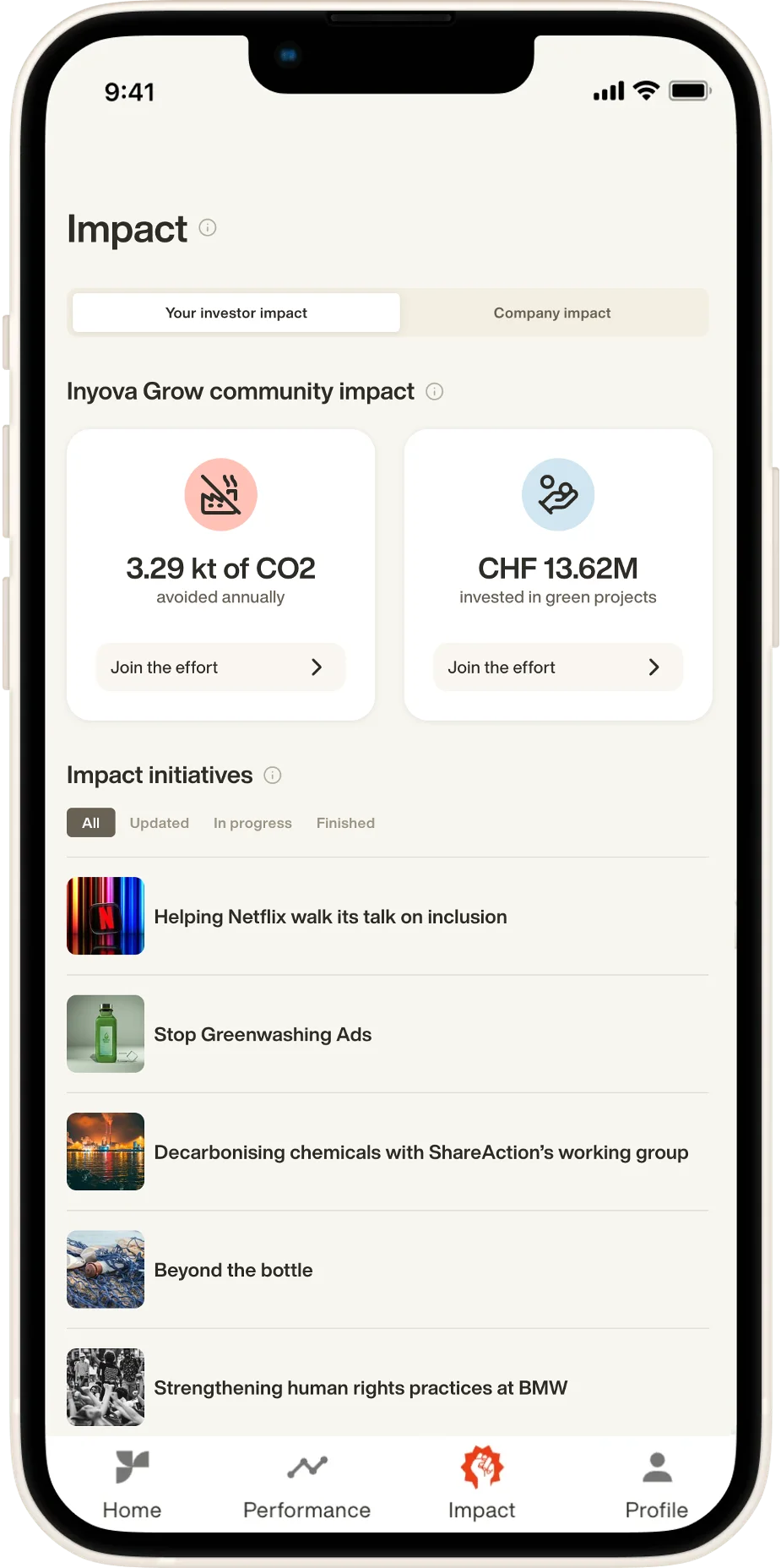 Inyova offers impact investing for all circumstances. Stock market investing with Inyova Invest. Earning interest with Inyova Grow. Or retirement planning with the Inyova 3a.